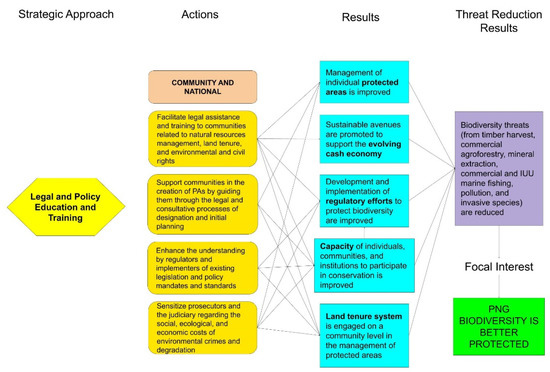 To develop specific recommendations for biodiversity threat reduction we also looked at each of the “High” threats identified in the SWOT analysis and then identified those strategic approaches that could alter the linkages between drivers and threats or reduce the effect of the threats to biodiversity [36,37]. We then evaluated all potential strategic approaches relative to how many of the “High” threats each approach addressed. We distilled this into three primary strategic approaches: (1) Strengthening capacity for environmental decision-making, (2) Legal and policy education and training, and (3) Integrated land use planning. Although priority was given to addressing the top threats, the recommended strategic approaches also simultaneously address a large number of lesser (Medium, Low) threats. We used Results Chains to clearly illustrate the interactive linkages between recommended actions and desired results across all three strategic approaches at both the community and national levels [21,37]. Detailed descriptions and methods for constructing Results Chains are found in USAID [37].