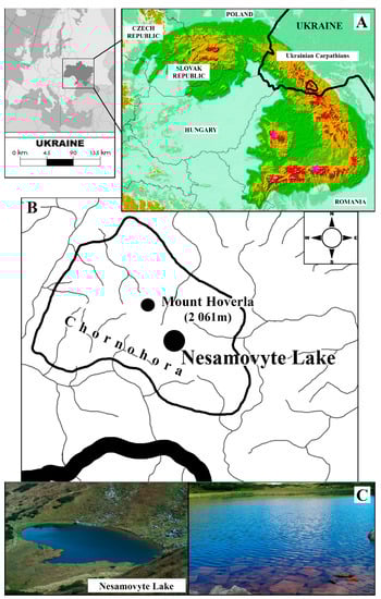 Map of the Carpathian region and the location of the Nesamovyte Lake. (A)—the Carpathian Mountains with its Eastern part the Ukrainian Carpathians. (B)—map-scheme of Chornohora Massif with the location of the lake. (C)—littoral zone of the lake.