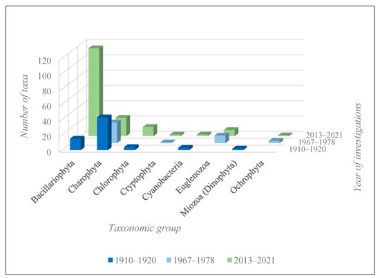 The total dataset regarding the composition of algae covering a 100-year period of investigations presents unique information for a comparative study between the different decades of studies and reveals some defining features in each. The low similarity between years of studies could be a result of the changes that happened with the Nesamovyte lake. Ecological analysis allows us to determine possible reasons for such changes. Some similarity between 2013–2021 and 1910–1920, is in contrast to the 1967–1978 years of investigation (Figure 3) and is attributable to the nature of the study of species diversity during the middle period. The coverage of only two taxonomic groups of algae—Euglenozoa [] and Desmidiales [] were conducted during 1967–1978, while the studies of the species diversity at the beginning of ХХth century and ХХIst centuries covered the diversity of all taxonomic groups of algae.