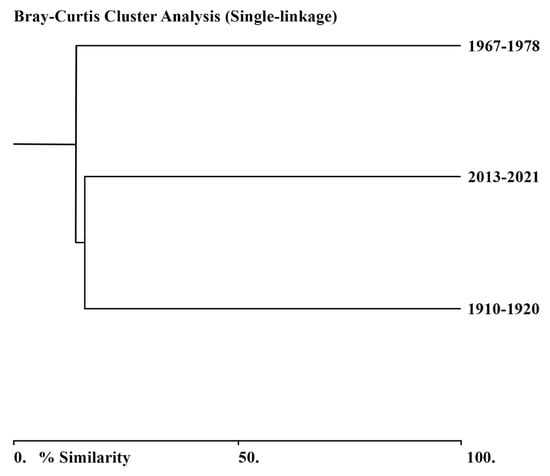 The Cluster analysis of algal composition was carried out using the Paleontological Statistics Software (PAST, Palaeontological Association, Hammer & Harper, Oslo, Denmark, Galway, Norway, Denmark, Ireland) to measure the degree to which species composition was similar among the studied periods (1910–1920, 1967–1978, 2013–2021) []. For this purpose, the presence/absence of data were used in the meaning of the Sørencen coefficient, calculated in the program as Bray-Curtis Similarity index [].