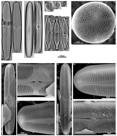 - Krammer, K. Die cymbelloiden Diatomeen. Eine Monographie der weltweit bekannten Taxa. 1. Allegmeins und Encyonema Part. In Bibliotheca Diatomologica; J. Cramer: Berlin/Stuttgart, Germany, 1997; pp. 1–382. [Google Scholar]