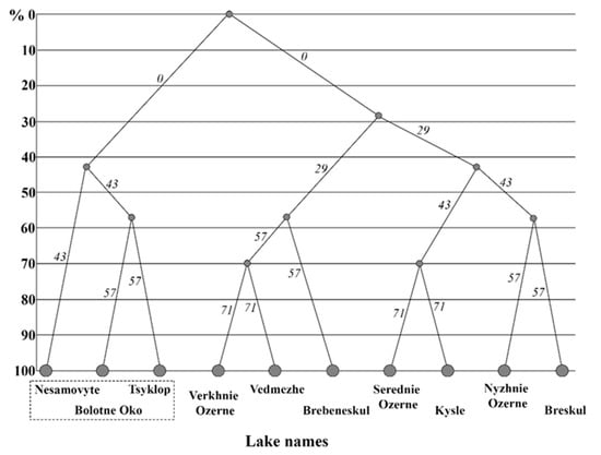 Our previous investigations [,,] for the comparison of the floral community similar to the Chornogora mountain group revealed a low level of similarity and spatial separation among the lakes of the group (Figure 5). However, the Jaccard coefficient with 43% distinguished a group of lakes—Nesamovyte, Bolotne Oko and Tsyclop with similar algal composition.