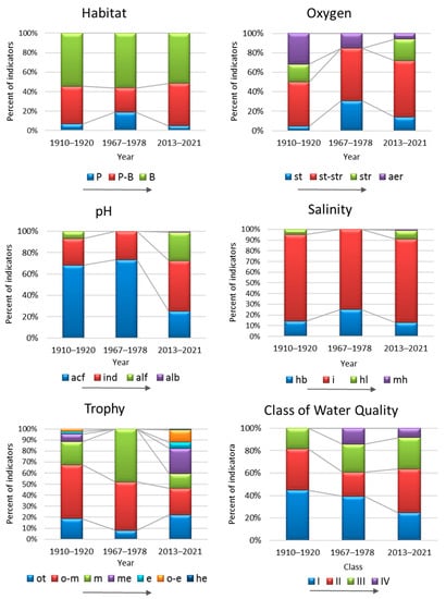 Environmental analysis is based on the types of indicators, which are grouped according to the following characteristics: habitat preferences, streaming and oxygenation, pH, salinity, trophic state, organic pollution (water quality class) (Figure 6). With the help of ecological preferences of species grouped by the previously mentioned time intervals (I—1910–1920; II—1967–1978; III—2013–2021), the ecological characteristics of these periods are also presented.