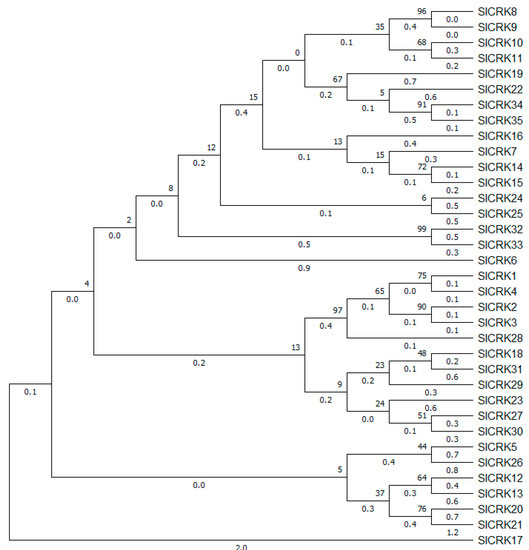 Phylogenic tree of SlCRK genes constructed by maximum likelihood method, JTT substitution model with 1000 bootstrap replicates. The numbers around the nodes indicate the branch lengths and the numbers below the branch indicates the frequency.