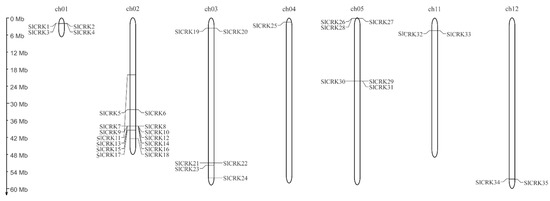 Genetic map of SlCRK genes in 7 chromosomes out of the 12 chromosomes of Solanum lycopersicum.
