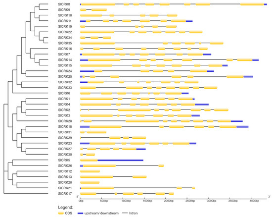 Gene structure analysis of SlCRK genes. Yellow boxes, blue boxes and lines indicate exons; untranslated regions indicate introns.