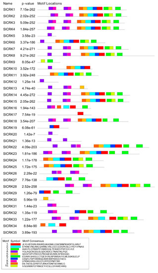 We then searched for conserved motifs through the MEME suite (Figure 5). SlCRKs have common conserved motifs, including salt stress response/anti-fungal domain (PF01657), protein kinase domains (PF00069) and protein tyrosine kinase (PF07714). Twenty-five of thirty-five SlCRKs have salt stress response/anti-fungal domain (PF01657); among them, 18 SlCRKs have two salt stress response/anti-fungal domains (PF01657). Twenty-four SlCRKs have tyrosine kinase domain (PF07714) and 26 SlCRKs have protein kinase domain (PF00069). SlCRK30 does not contain one of these characteristic conserved motifs from MEME, but its protein sequence is homologous to cysteine-rich receptor-like protein kinase (PTHR27002: SF128) through PANTHER (Protein ANalysis THrough Evolutionary Relationships) classification.