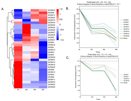 Expression pattern of SlCRK genes. (A) Heat map expression profiles of SlCRK genes in high temperature treatment at 0 h, 24 h, 48 h, and 96 h. The scores are Z-score transforming FPKM values. (B,C) Significant expression model (0, −2, −2, −3) and (0, −1, −1, −3).