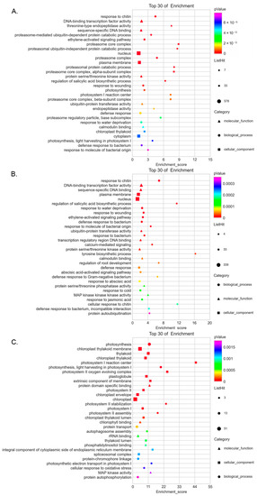 GO enrichment analysis of co-expressed genes with SlCRK genes. The Y axis corresponds to the GO term. The X axis corresponds to the Enrichment Score. Different shapes correspond to different GO categories (BP, CC, MF). The size of the dot corresponds to the number of different genes in the GO term and the bubble color is changed from purple-blue-green-red. The smaller the enrichment pValue, the greater the significance. GO enrichment analysis of co-expressed genes with all SlCRK genes (A), SlCRK genes of model 1 (B) and model 2 (C).