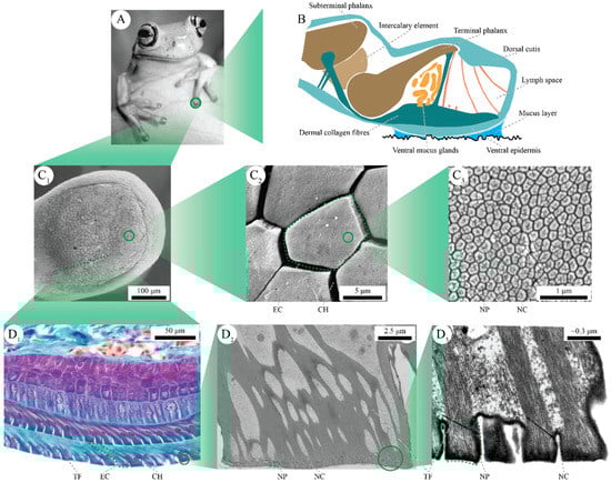 - Nakano, M.; Saino, T. Light and electron microscopic analyses of the high deformability of adhesive toe pads in White’s tree frog, Litoria caerulea. J. Morphol. 2016, 277, 1509–1516. [Google Scholar] [CrossRef] [PubMed]