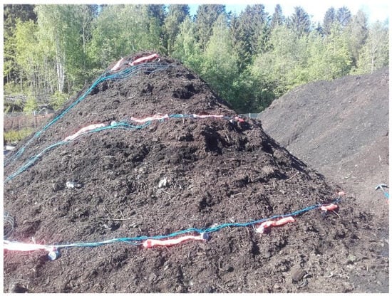 Composting of organic masses can be done in a tunnel or windrow compost, and the process has multiple stages [23]. Efficient composting is a result of a complicated process dependent on many variables such as time, temperature, oxygen availability, microbe community and moisture [24]. These factors are controlled by mixing different kinds of organic masses together, and with turn-arounds that maintain adequate oxygen levels. After initiation, as the process develops, the temperatures range from thermophilic to mesophilic [25]. Additionally, the pH may vary from acidic (4.5) at the beginning of the process up to 8–9, and the interaction pH and temperature may considerably affect the microbial activity [25]. Biomasses can be handled inside tunnels with moisturizing or outside in ricks where moisturizing is taken of care naturally [23].