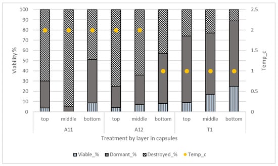As the results of the composting experiments were divided by process time, the significance of temperature was revealed (Figure 3). Seeds were less likely to survive if number of days with >50 °C rise and number of days with <30 °C stayed low. One-month of windrow composting has risk for seed survival (viable seeds on average 5.1% and dormant seeds on average 28.4%, N = 580). A larger proportion of seed survived either as viable or dormant in mesophilic temperatures compared to thermophilic stage (Figure 4). However, temperatures varied between layers largely depending on the outer and inner parts of the ricks (Figure 5). In the 30-day windrow composting experiments (A11, A12), days in which mean temperature stayed under 30 °C were mostly in the bottom layers (12 and 19 days in A11 and A12, respectively). Both ricks also had several days in which temperature exceeded 50 °C (29 days in middle layer of A11 and 20 days in top layer of A12). In one-month windrow experiments A11 (N = 280) and A12 (N = 300) only capsules were used excluding the effect of static pressure. The temperature mode in the top layer was between 49.5–62 °C (SD 5.6–10.7), in the middle layer—42–71 °C (SD 7.4–12.5) and in the bottom layer—23.5–54.5 °C (SD 5.9–11.6).