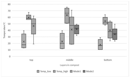 Temperature variation between layers (top, middle and bottom) in windrow (A11, A12, A2) and tunnel (T1, T2) composting experiments. Each layers loggers lowest and highest temperatures (Temp_low, temp_high) were measured as well as mode (mode 1–2) variations between treatments.