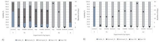 Proportion of viable, dormant and destroyed (A) Lupinus polyphyllus Lindley and (B) L. polyphyllus × Regalis after one-month tunnel (T1, T2) and four-month windrow composting experiment (A2) and in their control samples. Results are separated based on layers (top, middle and bottom). Temperature is included as days < 30 °C and days > 50 °C for each layer during one month.