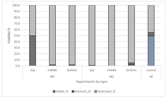In the farm-scale AD in the mesophilic patch-reactor the treatment time is long (155 and 132 days for M1 and M2, respectively) but because the temperature is kept in mesophilic conditions, its effect on seed destruction decreases (Figure 7). Only polyester bags were used in the AD experiments, allowing static pressure to have an impact (approximately 3N on bottom layer, 1.5N in middle layer and 0N on top). The control sample was inside the reactor without contact, but was affected by the temperature, gases and moisture, being similar to the M1 experiment’s top layer. Samples that had direct contact to biomasses had lower viability, especially samples that were in the middle or bottom layers. Average viability in the AD experiments was 0.5% as viable, 6.4% as dormant and 93.1% as destroyed. The highest viability was found in the M1 experiment top layer, where 50% of the seeds were dormant (SD 8.5).