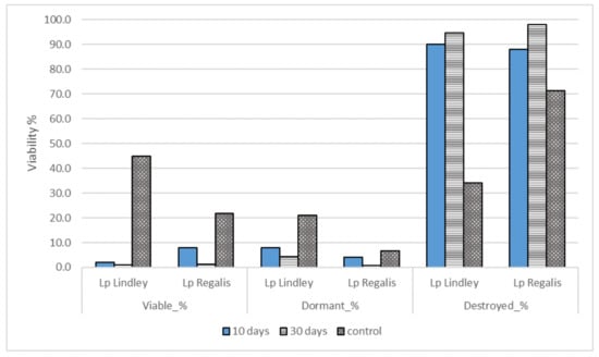 Proportion of viable, dormant and destroyed L. polyphyllus Lindl. ja L.p. Regalis seeds after 10 and 30-day laboratory-scale BMP experiment with control samples.