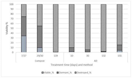 Proportion of viable, dormant and destroyed L. polyphyllus Lindl. seeds after composting and AD processes. Results from different experiments are combined based on the duration of treatment.