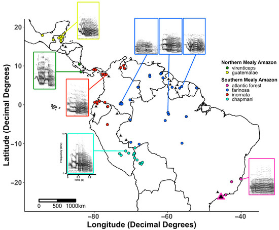 Map of vocal sampling locations. Spectrograms of representative calls from each clade are shown at their corresponding recording location. Spectrograms were created using the ‘spec_param’ and ‘specreator’ functions in warbler to optimize the visualization parameters (overlap = 90, window length = 475, color levels = (−50, 0, 5)). Genetic samples from the [36] study are indicated by grey-outlined triangles on the map. The location of the new genetic samples used in our study is indicated by the purple-outlined triangle.