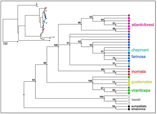 A total of 3444 bp from 6 genes (393 bp of 12S, 525 bp of 16S, 868 bp of CytB, 510 bp of ND2, 625 bp of TGFB2, 523 bp of TROP) were included in the maximum-likelihood phylogenetic analysis, though not all genes were able to be sequenced for every individual; see Table S3 for a complete list genes per individual. Notably, the forward reads for COI failed to sequence for all of the Atlantic Forest A. f. farinosa samples, so this gene was removed from the analysis. With the addition of the ND2 mtDNA sequence and the exclusion of the COI mtDNA sequence, the topology of our maximum likelihood majority rule consensus tree is nearly identical to the phylogeny reported by the original [36] study for taxa included in both studies (Figure 2). The Atlantic Forest population of A. f. farinosa is recovered as a monophyletic group sister to the assemblage that includes the three recognized subspecies of A. farinosa (A. f. inornata, A. f. chapmani, and A. f. farinosa). This group does not, however, show the same level of genetic differentiation as the two currently recognized species of mealy amazon (A. guatemalae and A. farinosa; see insert of Figure 2).