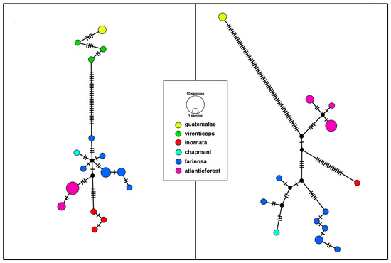 Two median joining haplotype networks [54] were constructed and visualized using PopART v1.7 [55]. The first network includes all of the available mitochondrial genes (12S, 16S, CytB, ND2) because we were able to obtain sequence data for both recognized species, at least four of the five subspecies (all minus virenticeps), and Atlantic Forest population of A. f. farinosa. The second network was created using only CytB data, as this most closely resembles the data set used by [36].