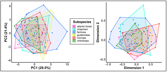 Acoustic variation in call data. Plots of acoustic variation in contact calls based on principle components analysis of 27 call measures (left) and a multidimensional scaling of spectrogram cross-correlation values (right). The points represent individual calls, and the polygons represent the total area of occupied by each clade’s set of calls in acoustic space.