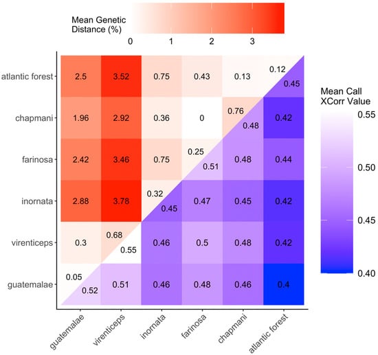 Matrix comparing net between group genetic distance with mean call cross-correlation values. For both sets of values, darker colors indicate greater dissimilarity between clades and lighter colors indicate greater similarity between clades. ‘Mean genetic distance’ is the numeric average of all pairwise distances (i.e., number of nucleotide substitutions) between clades, computed with the Kimura 2-parameter distance estimation model.