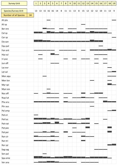 In 2019, a total of 34 macrophyte taxa were recorded within the entire set of 19 sections of the Ljubljanica River (Figure 2). The greatest diversity of macrophyte taxa was recorded in the upper part of the river (sections nr. 1–7). We identified a significant correlation between the number of taxa and distance from the source (Table 2). The closer we got to the part of the river in the city of Ljubljana, the less diversity we found (Figure 2). The lower diversity was probably also a consequence of less natural land use, which was documented in this research (Table 2). The distribution and abundance of macrophytes along the Ljubljanica also changed (Table 1). In the upper sections, the abundance of macrophytes was high (sections nr. 1–6), but in the middle part, the species appeared with a high abundance only in certain areas, indicating worse environmental conditions and nutrient inputs from the catchment (sections nr. 11–13). Filamentous algae appeared in all examined sections, appearing with higher abundance in the lower part of the river, from sections downstream of nr. 7, and where their mats covered the macrophyte stands.