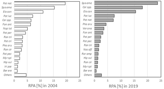 Comparison of the relative plant abundance (RPA) in different time periods. The value is expressed as a percentage and represents the biomass of each species in the watercourse.