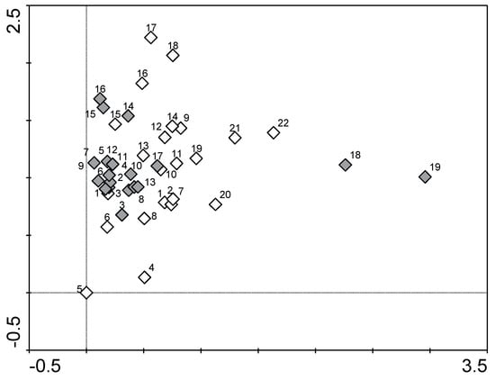 DCA plot showing the clustering of locations along the river flow based on different macrophyte species’ presence and abundance. White diamonds—2004, grey diamonds—2019.