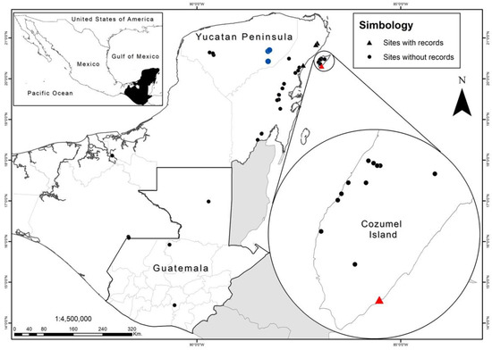 Collection sites for zooplankton samples in the YP, Mexico (2005–2020), where diaptomids are present. Black circles are negative records of Mastigodiaptomus ha; triangles are positive sites for records of M. ha. The red triangle is the place where the species was founded on Cozumel Island. Blue circles indicate probable presence of this species.
