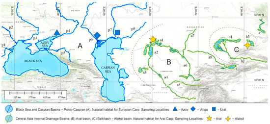 Kazakhstan ichthyologists describe two common carp subspecies in the natural reservoirs of Kazakhstan: C. carpio carpio and C. carpio aralensis. Kazakhstan’s Ponto-Caspian wild carp inhabit the Ural-Caspian basin (Caspian Sea, Ural River, and Shalkar lake). The Aral carp was described in the Aral-Syr Darya basin with the Syr Darya, Sarysu, Chu rivers, and Kamystybas, Akchatau, and Bugun lakes on the west, and Balkhash-Ile basin with Alakol Lake on east Kazakhstan. Moreover, the Aral carp area is limited by the Syr Darya river basin (Uzbekistan) and Issyk-Kul Lake (Kyrgyzstan) to the south [8]. Different ecological forms of Aral carp have been described, which evolved in diverse natural habitats [8,9].