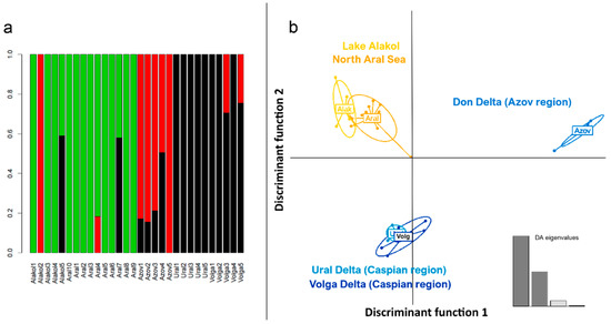 We conducted a discriminant analysis of principal component (DAPC) of the five carp populations to estimate the differences between them. DAPC analysis revealed discrimination between joint Aral-Alakol and Volga-Ural populations, as well as the Azov sea population. However, it did not reveal any differences within the Aral-Alakol sample as well as in the Volga-Ural population sample (Figure 2b). It is clearly shown that the Aral-Alakol carp combined sample differs from both the Volga-Ural and the Azov carp population samples, but not more than the Volga-Ural sample differs from Azov.