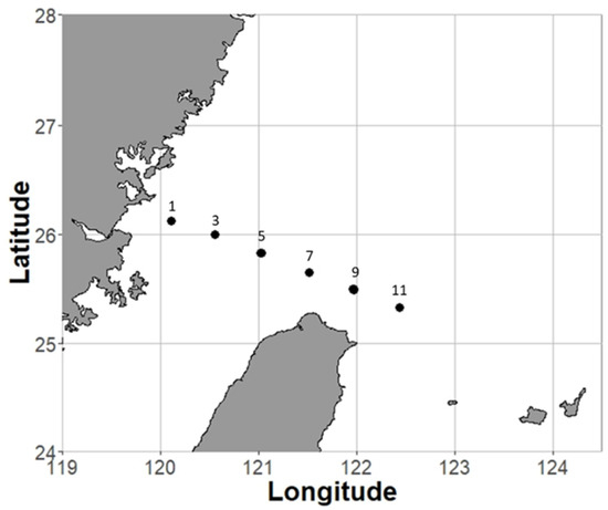 Sampling area and sites (1, 3, 5, 7, 9, 11) in the southern East China Sea.