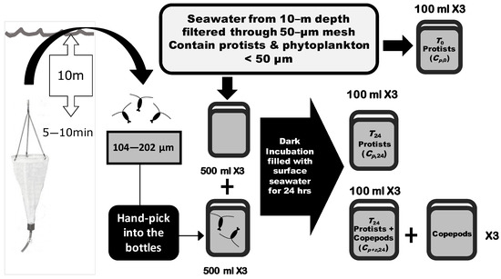 Incubation seawater was taken at a 10 m depth by 20 L Go-Flo bottles (General Oceanics). The collected seawater was filtered through a 50 μm mesh to exclude crustacean zooplankton and leave only unicellular heterotrophic protists and phytoplankton. Filtered seawater was then filled into 500 mL plastic bottles. For the control group, mesh-filtered seawater with only heterotrophic protists and phytoplankton was poured into three replicates of bottles. For the group with copepod grazing, the zooplankton community collected from the seawater was added into the bottles with filtered seawater. To collect living copepods, at each sampling site a 50 μm meshed Norpac net was set to a 10 m depth and allowed to drift with the ship for 5~10 min. The collected zooplankton were gently filtered through sieves of 202 and 104 μm sizes, and living zooplankton (mainly copepods) within this size range were randomly selected and placed into incubation bottles. The initial abundance of phytoplankton and heterotrophic protists were preserved in seawater-buffered 0.2% paraformaldehyde in 100 mL bottles in triplicate before the incubation (protists without cell walls may not be well preserved by this method). Both control and experimental bottles were incubated for 24 h in 200 L dark incubation tanks filled with constantly circulating surface seawater to inhibit photosynthesis (Figure 2).