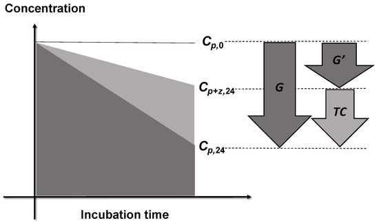 Definition of the intensity of trophic cascades (TC). Concentrations of phytoplankton at the beginning of incubation are shown by Cp,0. Concentrations of phytoplankton in the bottles without and with copepod grazers after 24 h of incubation are Cp,24 and Cp+z,24, respectively. Copepods ingest protists, thus the grazing from protists on phytoplankton is reduced in the bottles containing copepods. As a consequence, the phytoplankton concentrations in the experimental bottles with copepods and heterotrophic protists are higher than those in the control bottles with only heterotrophic protists. The elimination rate in the experimental bottles (G′) is lower than the elimination rate in the control bottles (G) by trophic cascade.