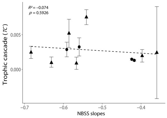 Relationship between the intensities of trophic cascades (TC) and the NBSS slopes. All values are shown as the mean ± 1 standard error. Negative values of TC were removed, as these experiments exhibited no trophic cascade. Triangular points indicate the TC calculated from the incubations with phytoplankton growth (Figure S2). The dash line indicates the best-fit regression line.