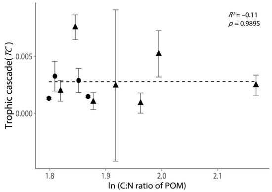 Relationship between the intensities of trophic cascades (TC) and the C: N ratio of POM. All values are shown as the mean ± 1 standard error. Negative values of TC were removed, as these experiments exhibited no trophic cascade. Triangular points indicate the TC calculated from the incubations with phytoplankton growth (Figure S2). The dash line indicates the best-fit regression line.