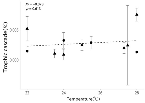 Relationship between the intensities of trophic cascades (TC) and the incubation temperatures. All values are shown as the mean ± 1 standard error. Negative values of TC were removed, as these experiments exhibited no trophic cascade. Triangular points indicate the TC calculated from the incubations with phytoplankton growth (Figure S2). The dash line indicates the best-fit regression line.