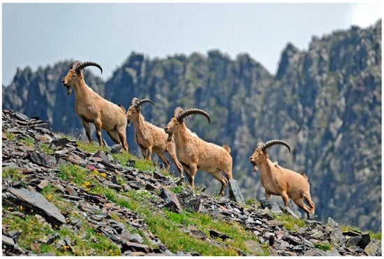 Caucasian tur in its natural habitat. Photo by M. Andreev and A. Andreeva (http://mountaindreams.ru, accessed on 17 June 2021).