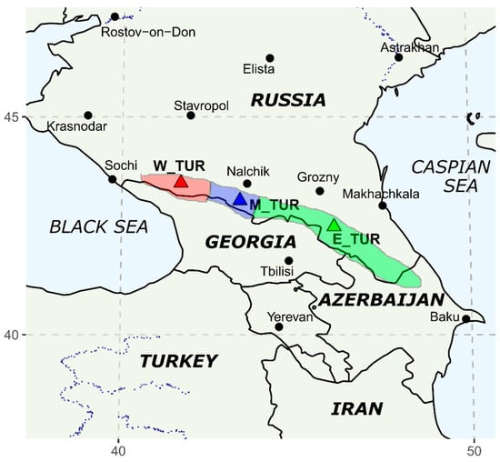 Map with sampling sites of Caucasian tur used in this study and the area of the species habitat. W_TUR = West-Caucasian tur, E_TUR = East-Caucasian tur, M_TUR = Mid-Caucasian tur.