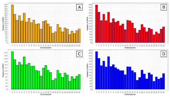 Number of polymorphic sites per chromosome in Caucasian tur (Capra caucasica). (A). Number of SNPs in all the studied populations. (B). Number of SNPs in West-Caucasian tur. (C). Number of SNPs in East-Caucasian tur. (D). Number of SNPs in Mid-Caucasian tur.