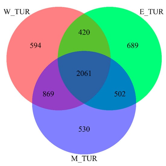 While 2061 polymorphic SNPs were common for all the Caucasian tur groups, the number of unique SNPs for W_TUR, E_TUR and M_TUR was 594, 689, and 530, respectively. The most shared SNPs between two groups was found in W_TUR—M_TUR pair—869, and the least number of shared loci was observed in W_TUR—E_TUR pair—420 (Figure 4).