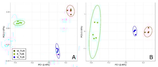 Principal component analysis (PCA) of the groups of Caucasian tur (Capra caucasica): (A) the first two components (PC1 and PC2), (B) the first and third components (PC1 and PC3). W_TUR = West-Caucasian tur, E_TUR = East-Caucasian tur, M_TUR = Mid-Caucasian tur.