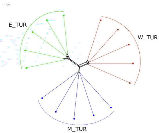 We observed the highest FST value between W_TUR and E_TUR—0.161. M_TUR was genetically closer to W_TUR than to E_TUR, but in both cases the differentiation was moderate—0.099 and 0.135, respectively.