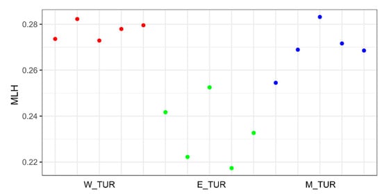 Individual heterozygosity values, which were represented by multilocus heterozygosity (MLH) showed that all the E_TUR individuals had lower heterozygosity (from 0.217 to 0.253) than both W_TUR (from 0.273 to 0.282) and M_TUR (from 0.255 to 0.283) (Figure 7).