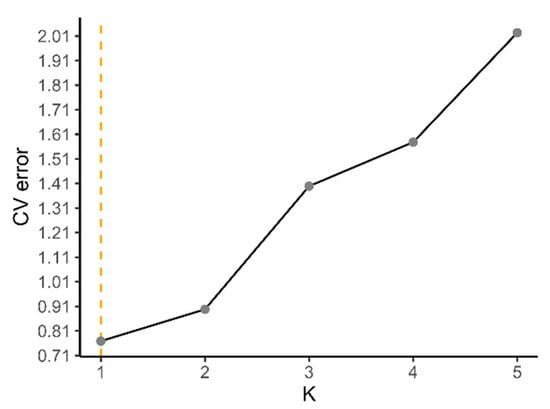 Admixture cross-validation (CV) error indicating the optimum number of clusters in the dataset.