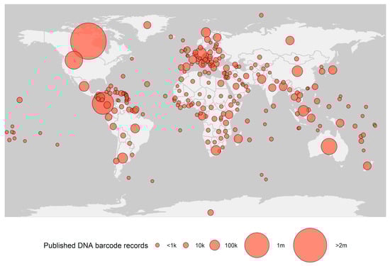 Number of public DNA barcodes available in Barcode of Life Data Systems (BOLD) by country (obtained 1 January, 2021).