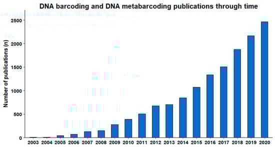 Publications per year registered in Scopus®, containing ‘DNA barcod*’ or ‘DNA metabarcod*’ in the title, abstract, or keywords (obtained 21 January 2021).