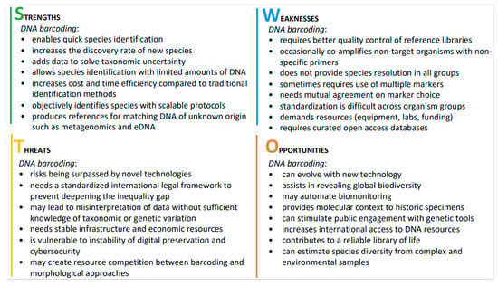 Major strengths, weaknesses, opportunities, and threats for DNA barcoding, resulting from the SWOT analysis.