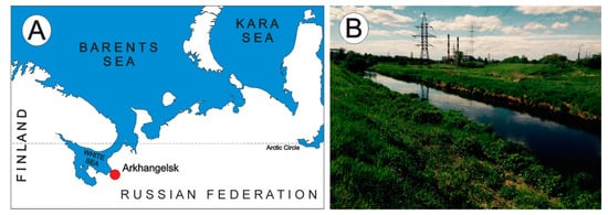 Map of the study area: (A) location map of Arkhangelsk City; (B) view of the Arkhangelsk Thermal Power Plant (TPP) channel. Photo BespalayaYu.V.